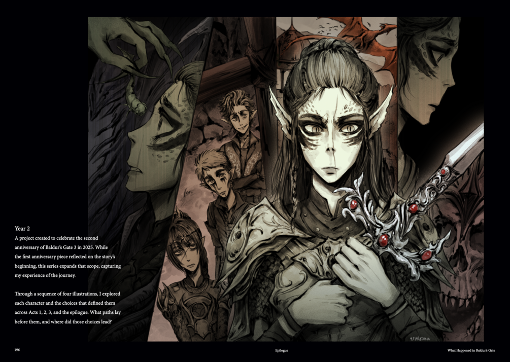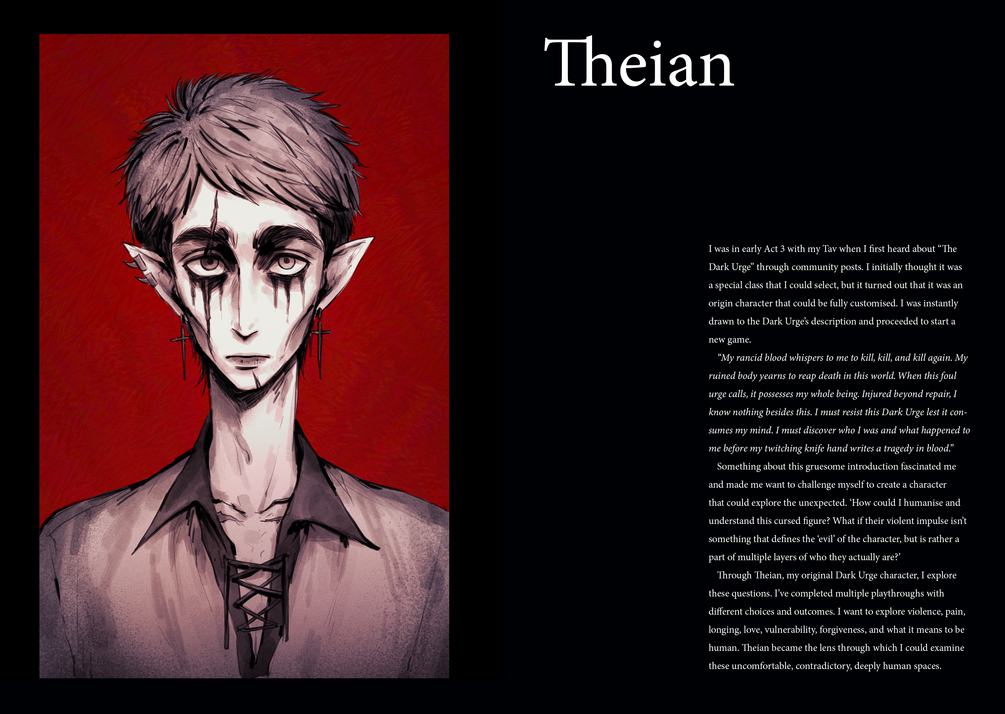 This is a PDF file of my personal fanart book, with a collection of artwork from June 2024 - Nov 2025. It focuses on the story of my Dark Urge OC, Theian, and his relationship with Astarion and his urge.